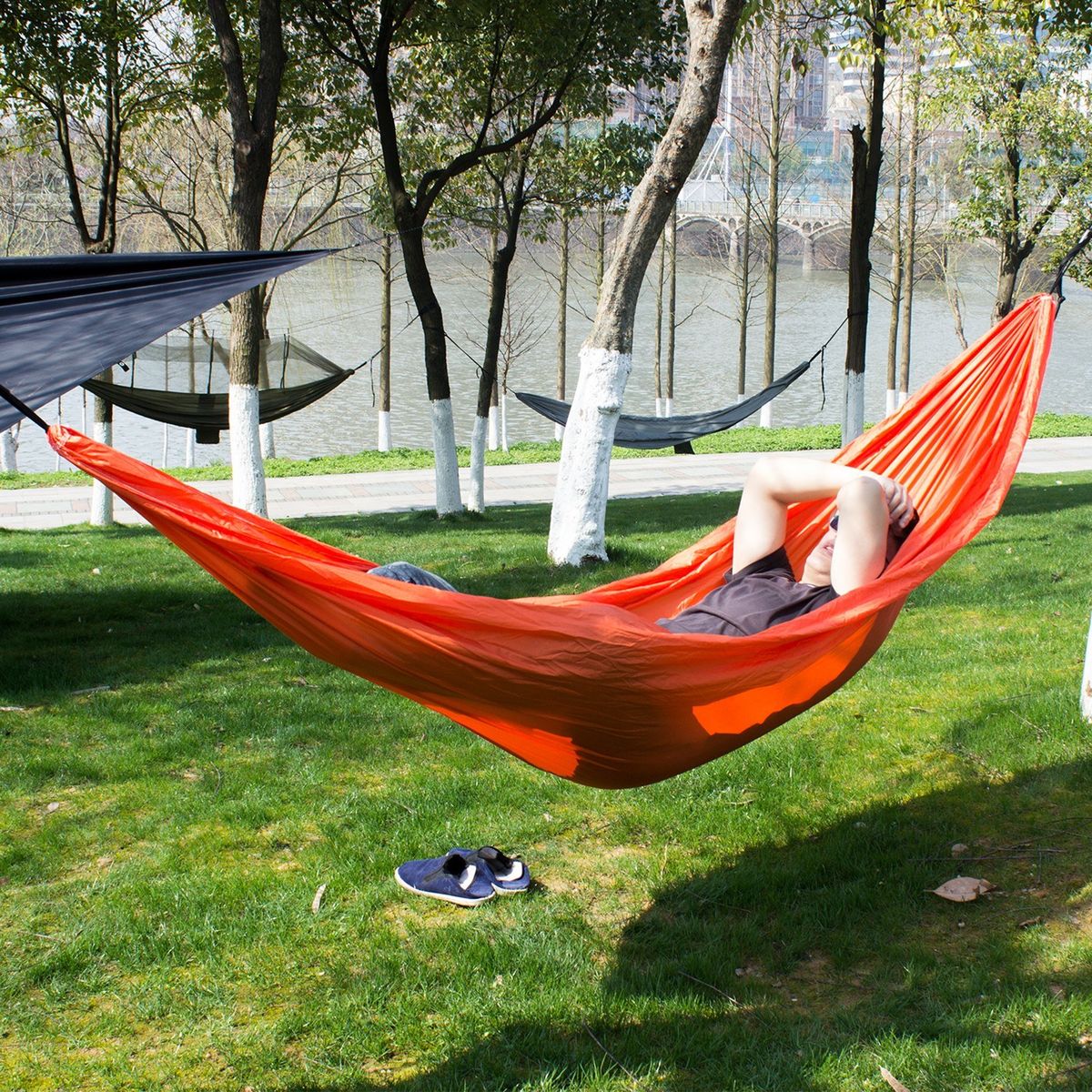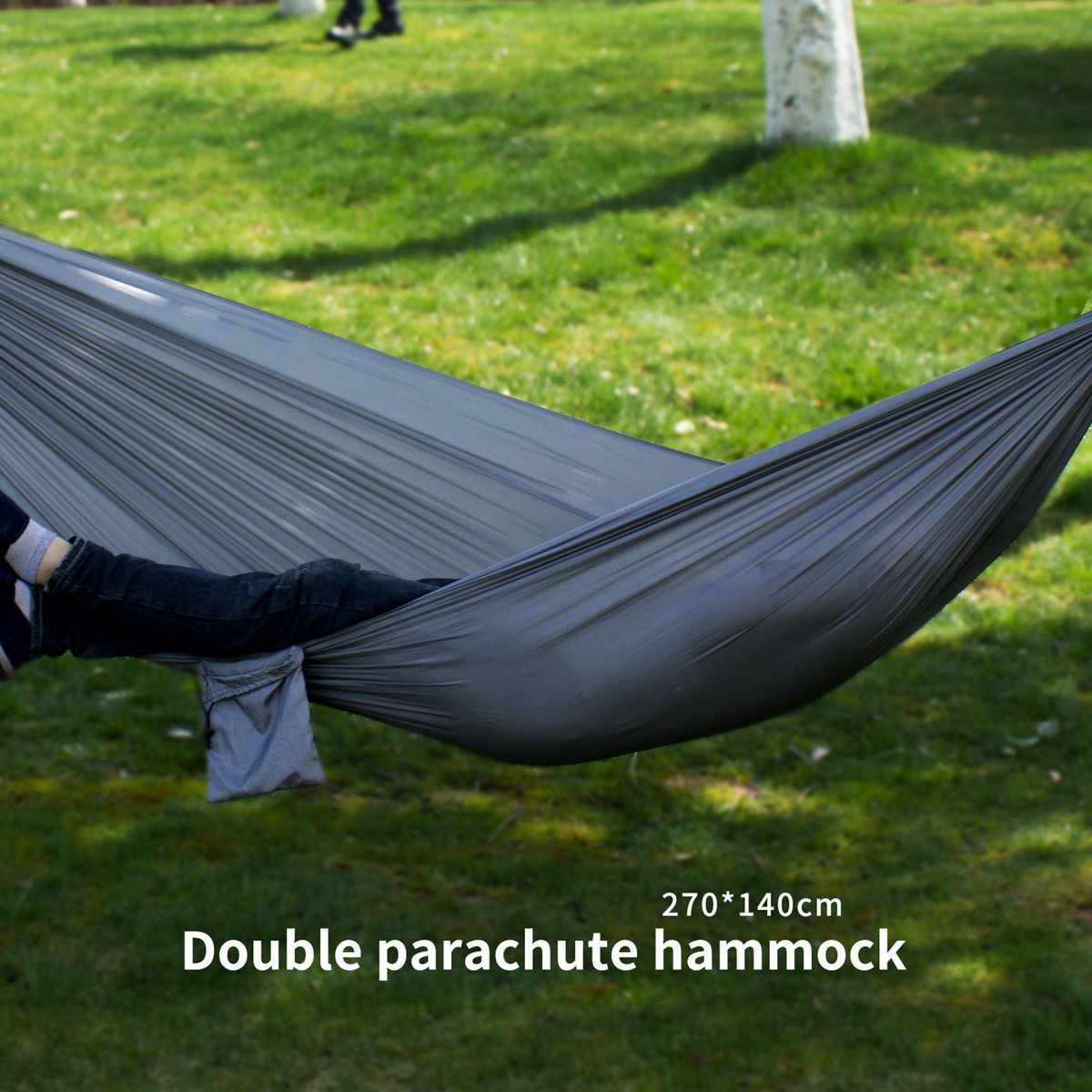 This hammock is made of high-quality 210T nylon material. Perfect for travel, camping, picnic, hiking or home use.