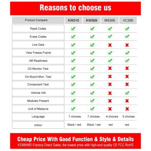 KW309 auto code reader can quickly read and erase all types of vehicle stored emission related trouble codes, pending codes, and show code definitions. Perfect fixed car diagnostic tool for car DIY mechanic and car owners.