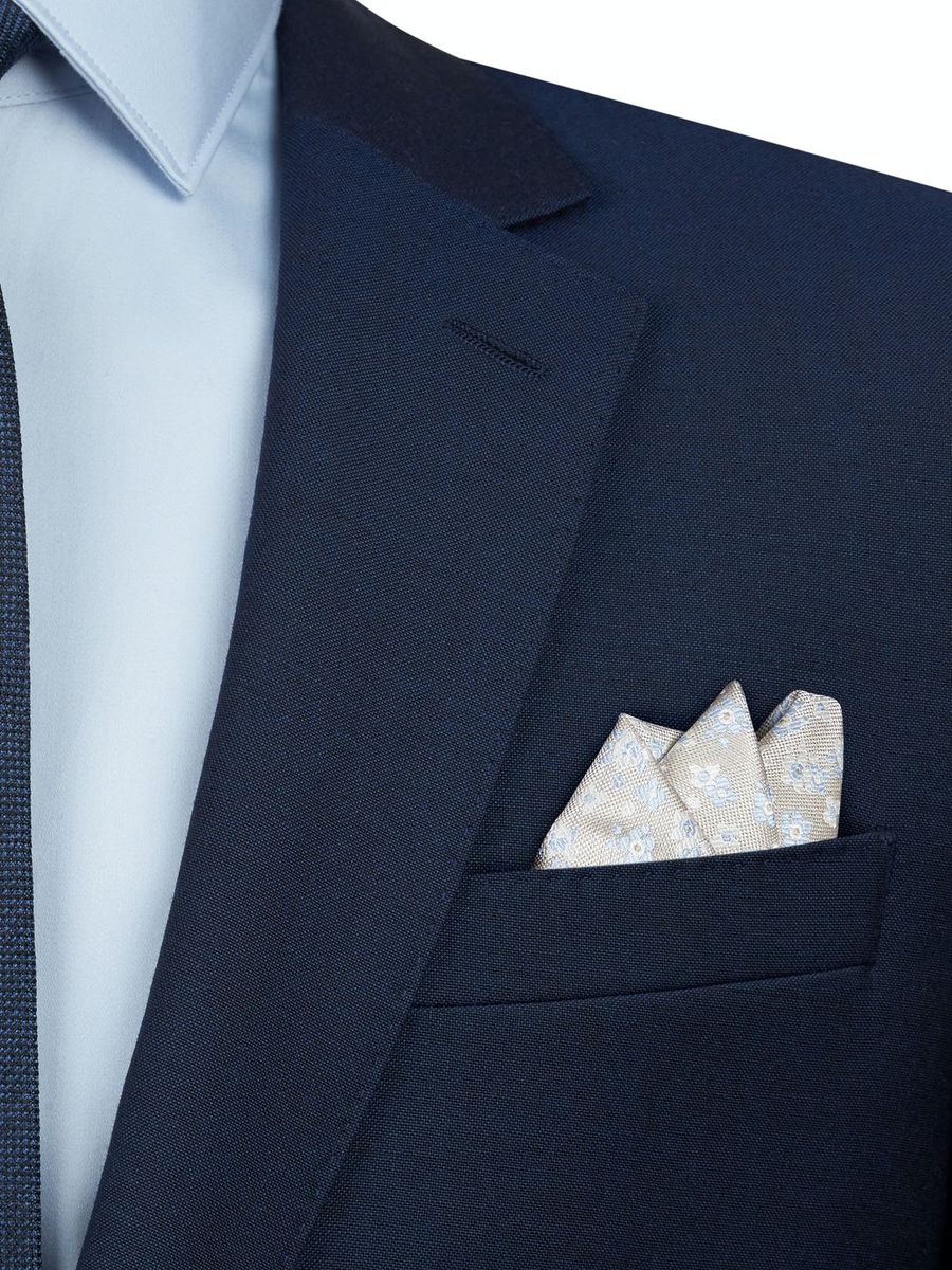 Champagne tones combine with a subtle floral motif to lend this pocket square an understated elegance and sophistication. It features a blue pattern set against a pale background to bring a hint of lightness to a dark suit, or simply to add the finishing touch to a summer wedding outfit.