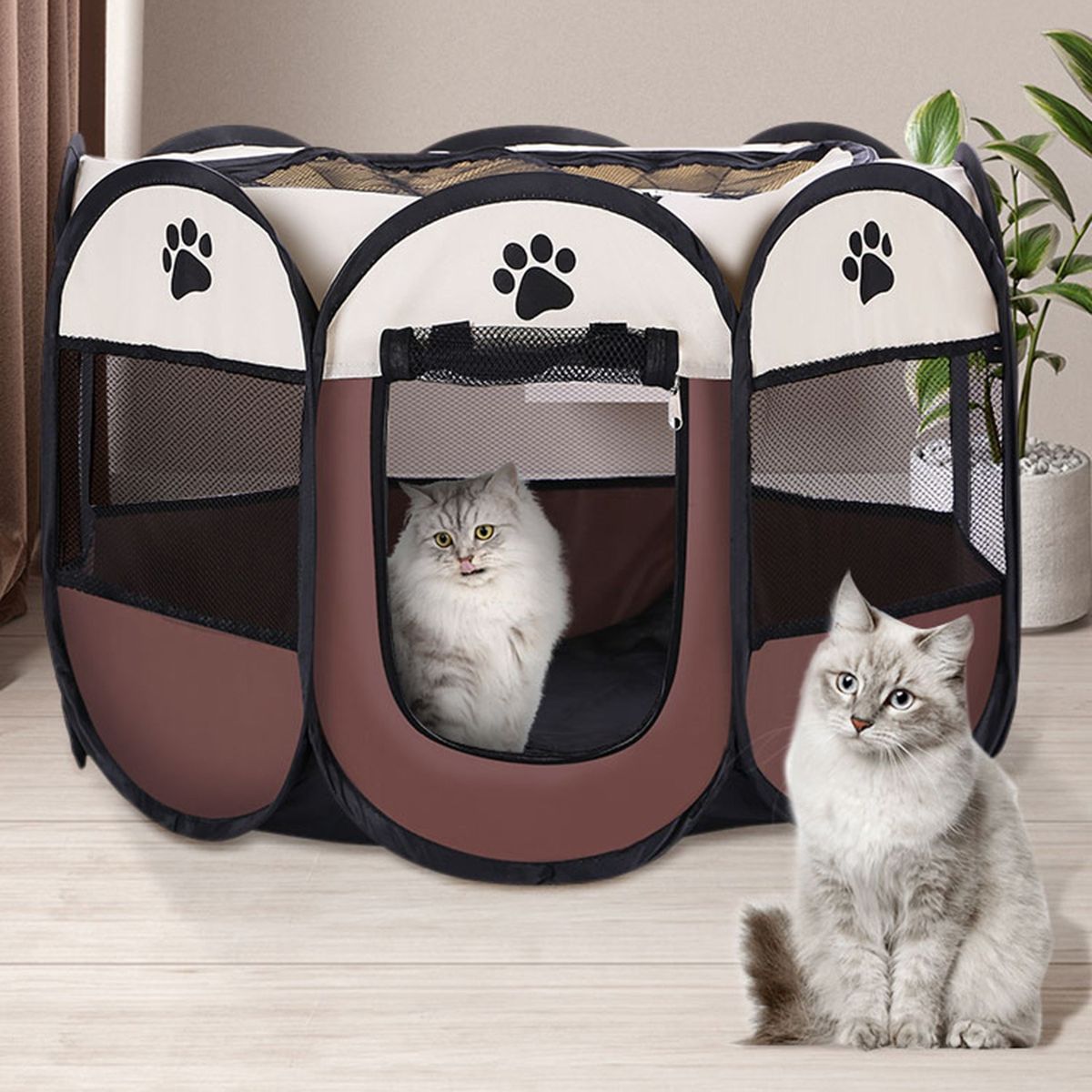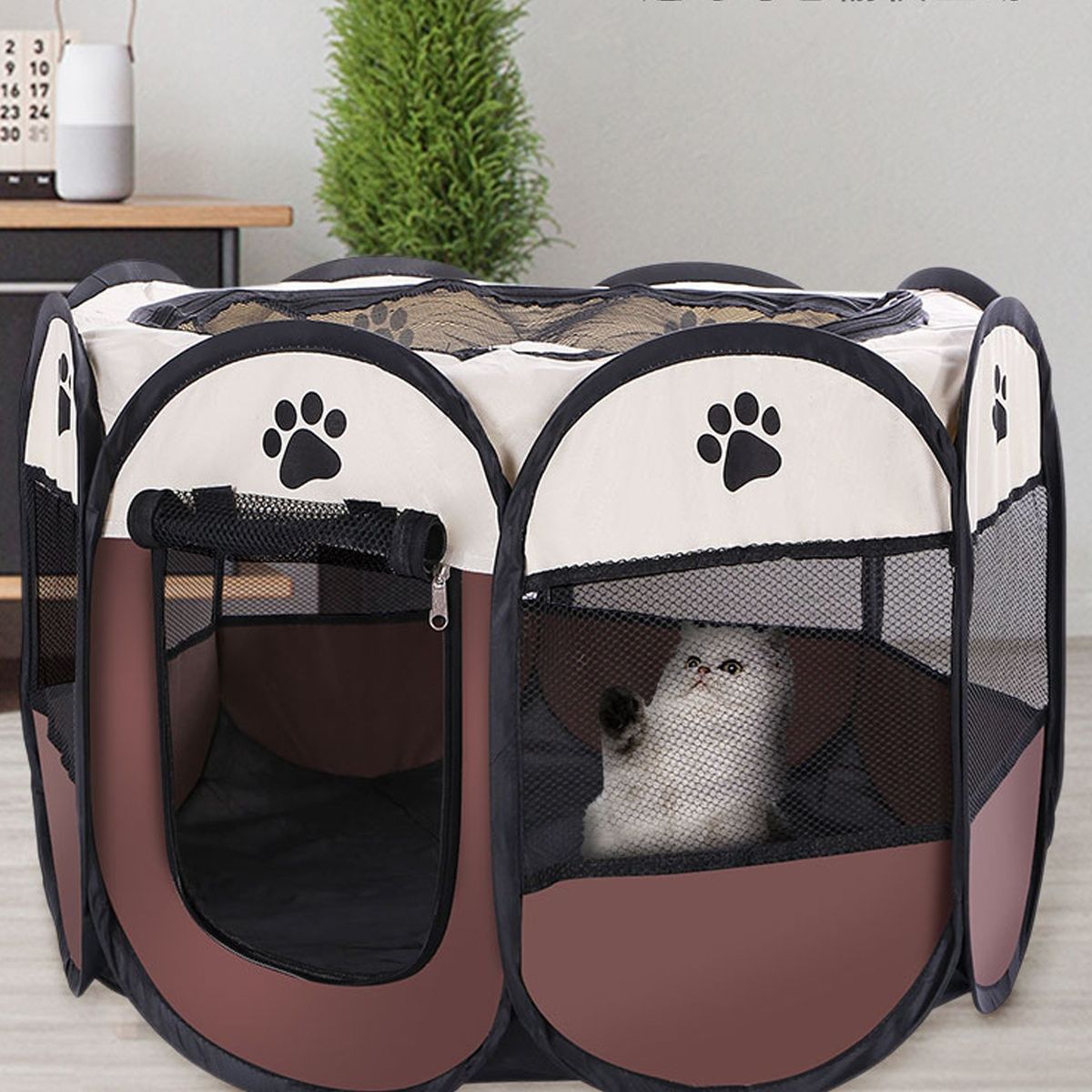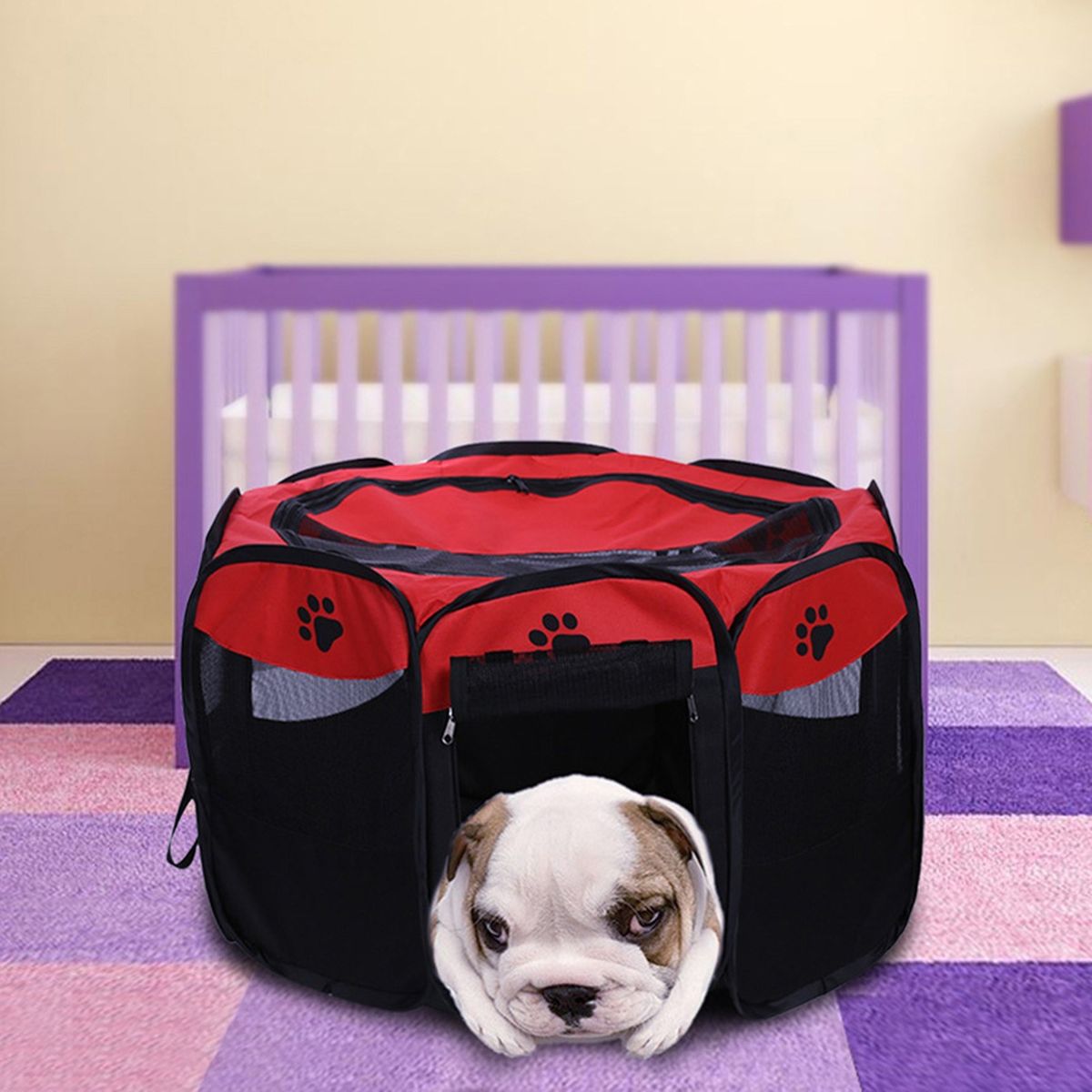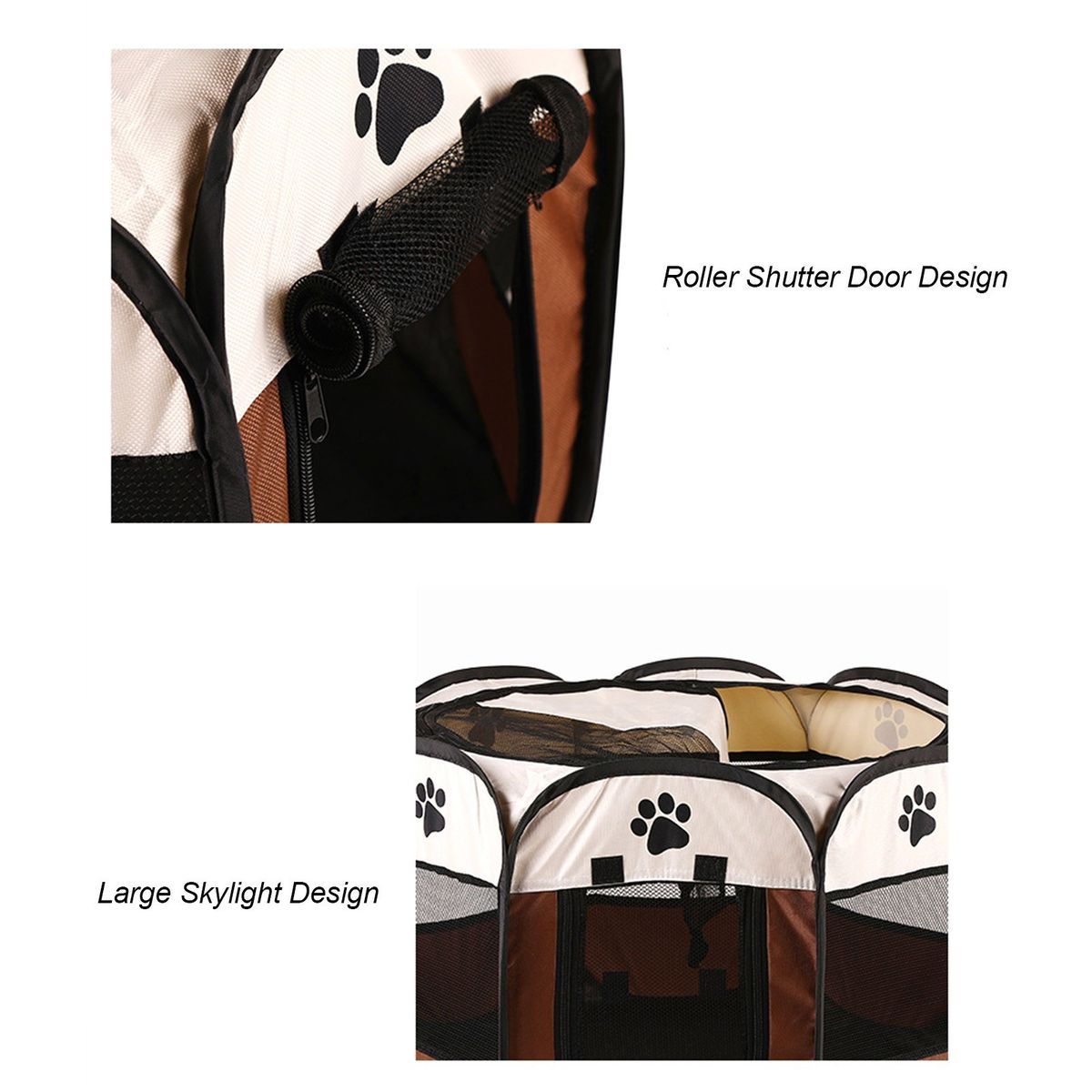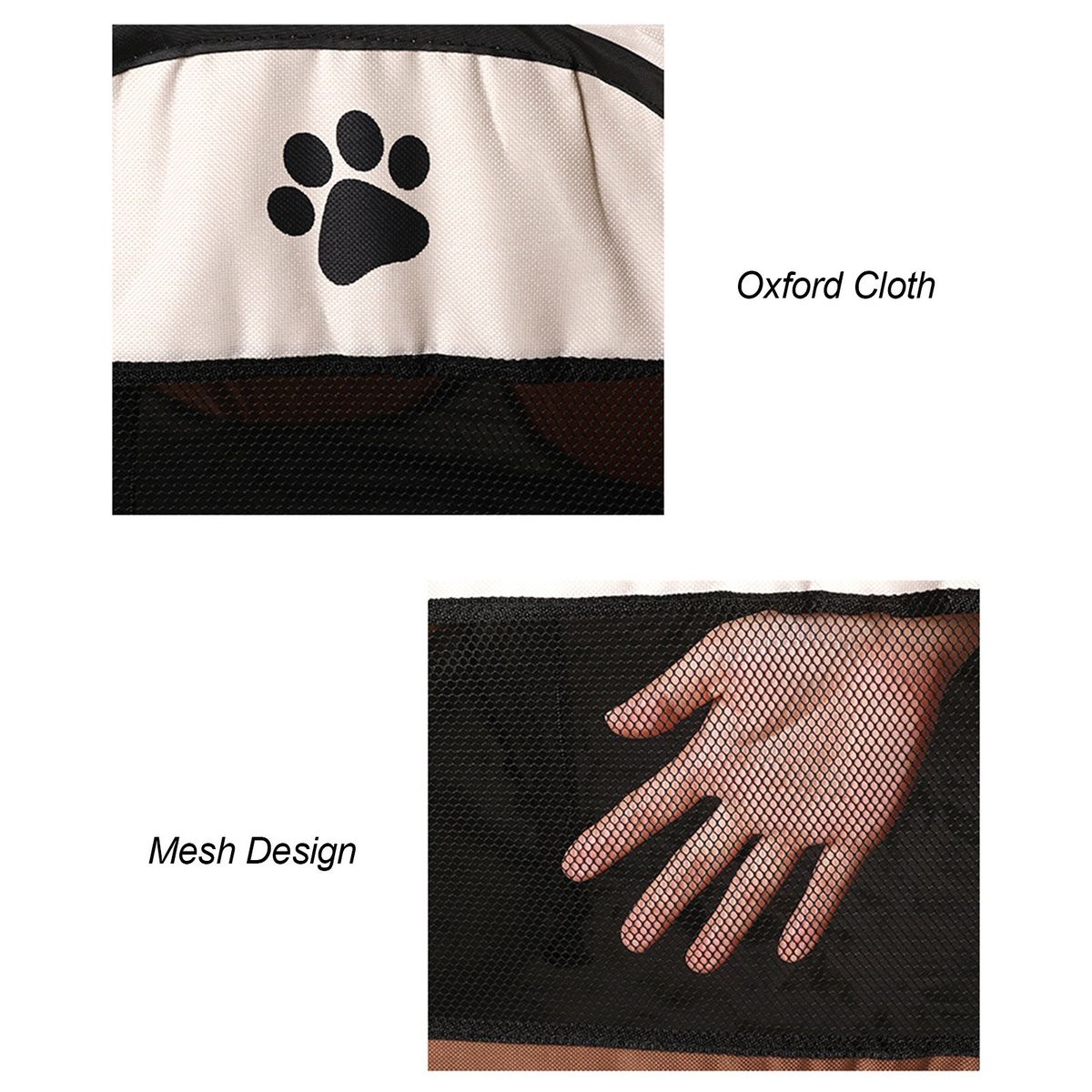 8 side-panels form a circular shape, composed of high-grade thick mesh and scratch-resistant Oxford cloth. Designed with spacious interior, well-ventilated , mesh roof to make sure that your pet doesn\\\'t feel anxious. Your pet can see everyone through the mesh, which make your puppy feel safe in it.