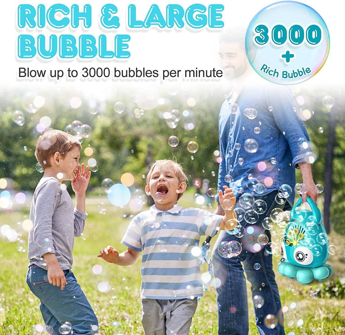 [High Output 3000+ Colorful Bubbles]With powerful motors, 8 spinning wands, the bubble maker can pour out more than 3000+ consistent bubbles per minute but less sound than others. It can blows faster, higher and further bubbles. The bubble is more beautiful and colorful. Just enjoy the pleasure of bubble blowing with your family, friends or your pets.