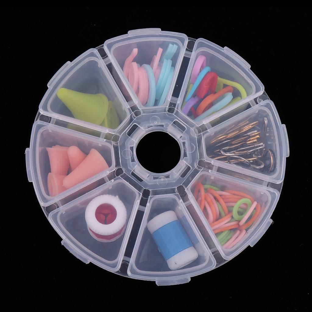 6 Pieces Knitting Point Protectors2 Pieces Row counter30 Pieces Metal Gourd Pins10 Pieces Stitch Markers10 Pieces Circle Stitch Markers15 Pieces Counter Rings1 Piece Storage Box