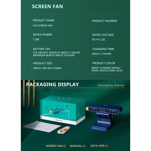 blue/green/whiteProduct specifications: 200mm×90mm×115mmPacking specification: 220mm×147mm×130mmProduct material: ABS+PCPacking material: kraft paper+coated paperRated power: 7.5WRated voltage: 5V/1.2ABattery capacity: 2400AmhCharging time: 1A adapter about 6 hours, 2A adapter about 4 hoursUse time: the lowest gear is about 480minThe most high-end: 180minProduct accessories: Android power cord + manualProduct net weight: about 441gProduct gross weight: about 617gPacking list: 1 x screen fan, 1 x outer packing box, 1 x data cable, 1 x manual