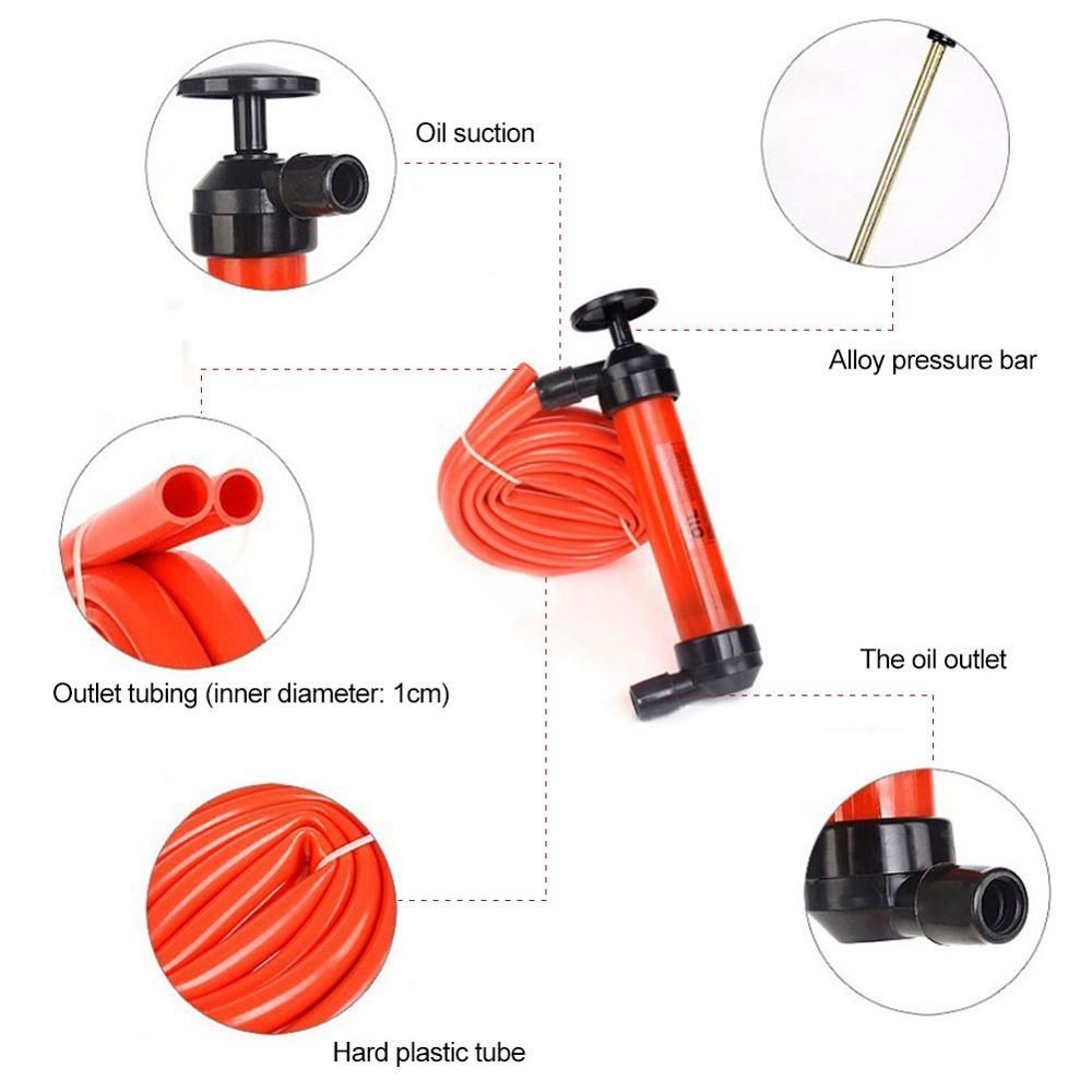 Scope of application: All kinds of oil and liquid. You can siphon off the liquid with this hand pump easily. Product Features: Insert the suction into the sending container and insert the discharge hose into the receiving container or fuel tank for the siphon action. The product is really an perfect companion for small gasoline power tools such as lawn mower, brushs, hedge trimmer and etc. Because it can help you to pump the gasoline from the car into the lawn mower easily, and you don't need to queue to buy oil in a gas station with a metal bucket in your hands anymore. Usages: Siphoning oil from the car to the oil tank, pumping oil / gasoline out of the oil tank, and transferring oil from one car to another car. Specifications: Capacity of the oil pumping tank: 200cc Length of the oil suction : about 1.3m/ 4.27ft Length of the oil outlet : about 1.3m/ 4.27ft Inner diameter of tubing :8mm Outer diameter of tubing :12mm Length of extension tube :1.2m Inner diameter of extension tube :3mm Outer diameter of extension tube :5mm Flow rate: 5L / min Precautions: 1. Try to keep the discharge port below the inlet nozzle while pumping, then the oil will continue to flow out automatically with the siphoning as you stop pumping. 2. After oil pumping and cleaning in each time, please affuse a small amount of oil into the inlet nozzle to make the connecting part between the suction bucket and rubber ring lubricated for the time of application. This measure can effectively prevent the oil plug from being worn, thus extending the service life of the fuel extractor. 3. The plastic types of the product aren't suitable for extracting lubricants or other viscous liquids in semi-liquid state. Package includes: 1 * Oil suction 1 * Oil outlet 1 * Extension tube 1 * Air 1 * Air valve 3 * Connecting set Notes: Transition: 1cm=10mm=0.39inch 1. Due to the different monitor and light effect, the actual color of the item might be slightly different from the color showed on the pictures. Thank you! 2. Please allow 1-3cm measuring deviation due to manual measurement.
