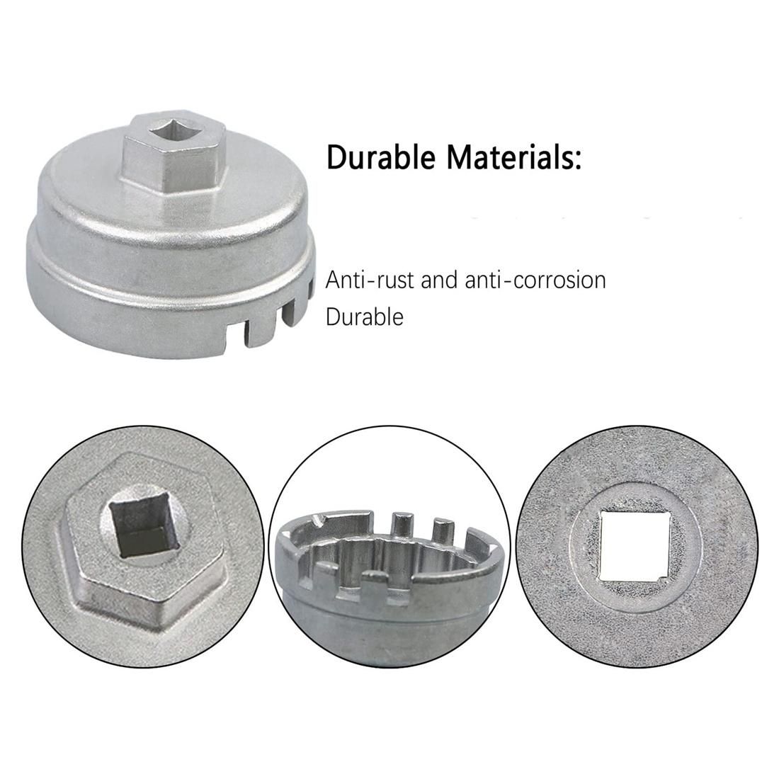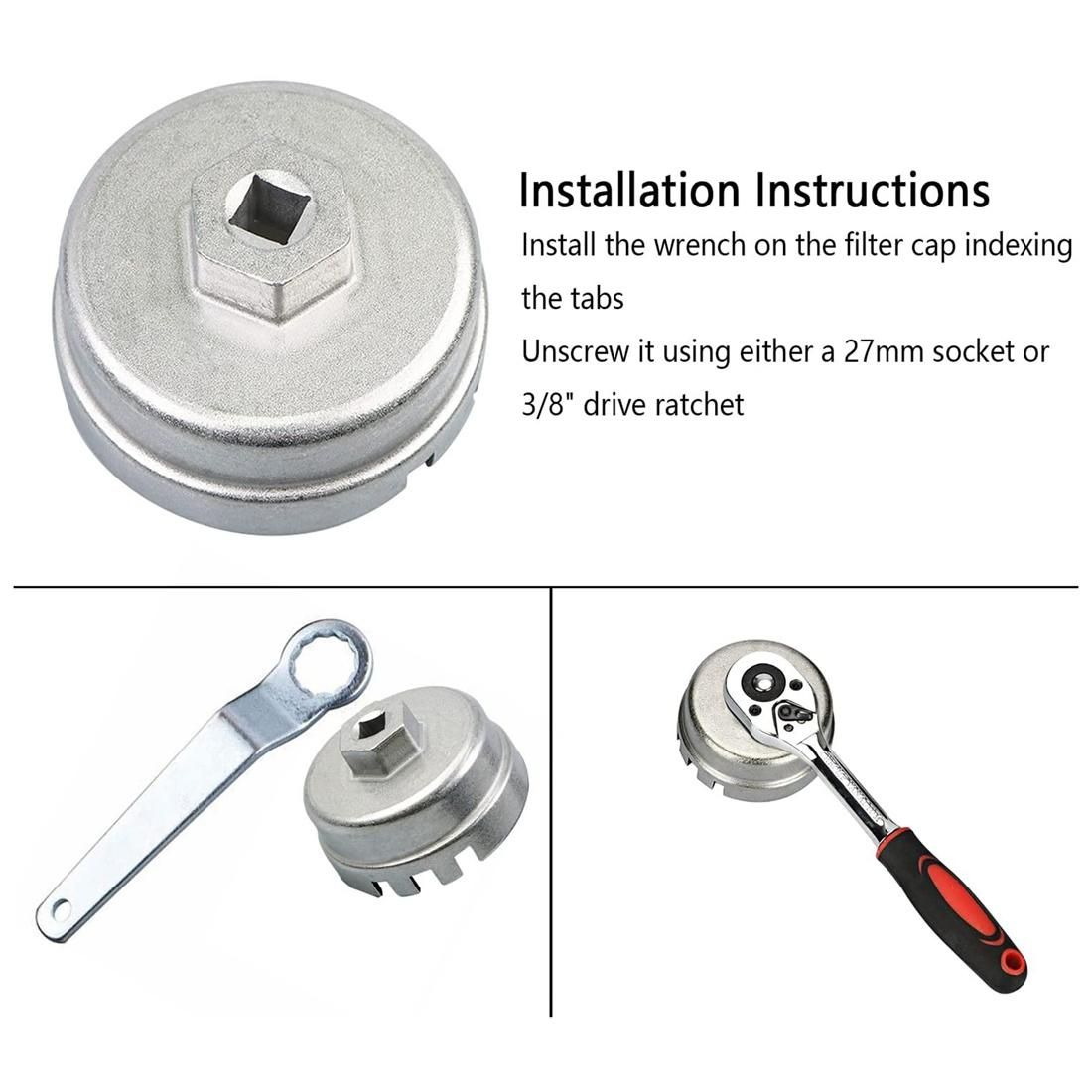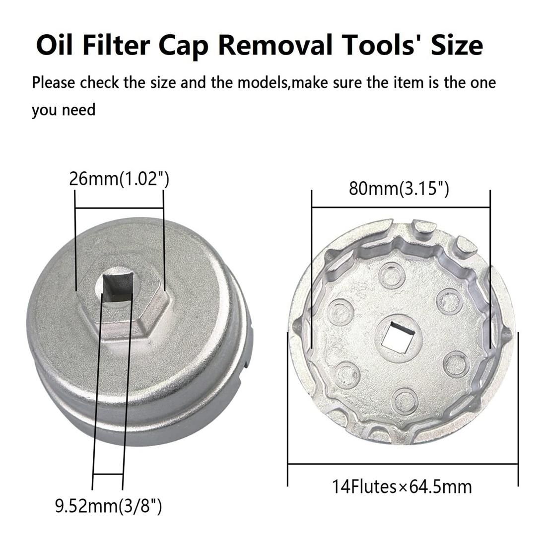 [Dimensions]64mm Oil Filter Housing Cover Removal Kit with 14 Flat Heads for 0.95inch (about 1.9cm) Drive. This oil filter cap spanner wrench has a special toothed design that firmly grips the oil tank housing without slipping. Use a 3/8inch square drive tool to remove the oil filter wrench. This oil filter removal tool is tough and durable enough to last a long time. You only need to match the oil filter cap when using it. Then use a socket wrench or ratchet wrench to unscrew