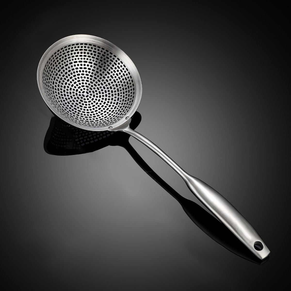 The oil strainer has long and thicken handle, which is easy for you to pick up heavy food.