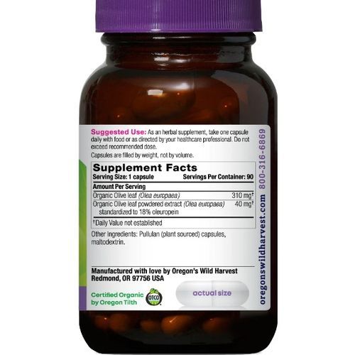 Contained in natural bovine gelatin capsules and free of artificial flavors, colors, excipients, or stearates, Oregon's Wild Harvest Olive Leaf Capsules are also gluten-free and dairy-free, contain no wheat, peanuts, soy, or corn allergens, and have been product verified Non-GMO by SGS, an independent third-party lab. As an herbal supplement, take one olive leaf capsule daily with food, or as directed by your health care professional.
