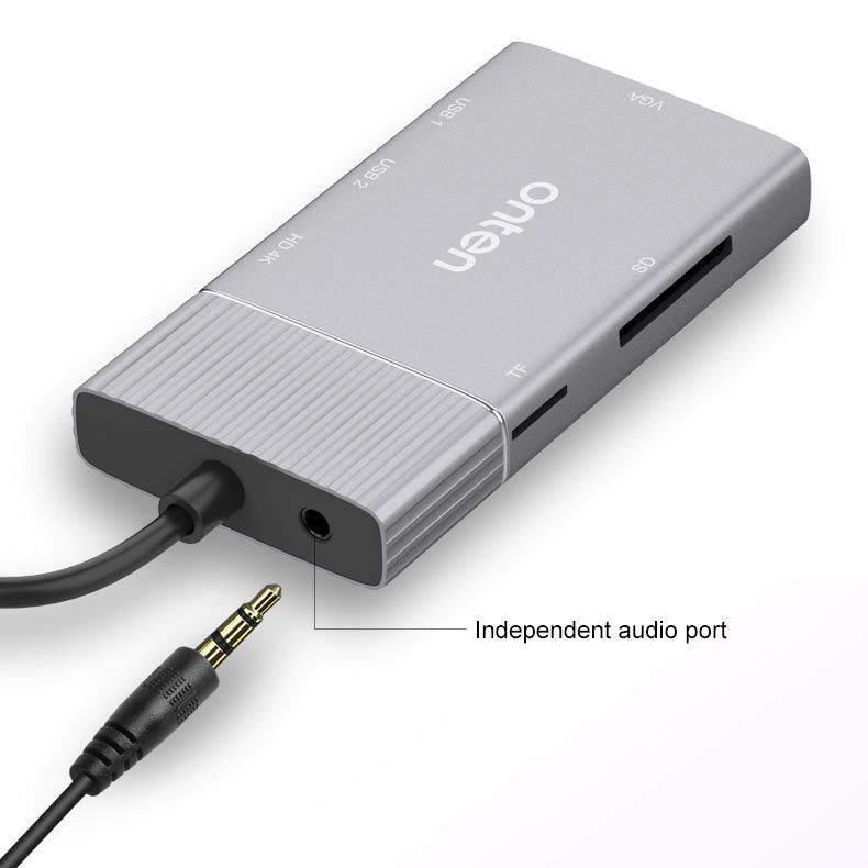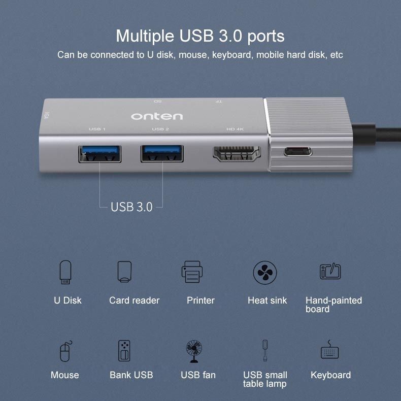 Onten 95113 8 In 1 USB 3.0 x2 + SD / TF + HDMI / VGA + 3.5mm Jack + Type-C / USB-C (PD 3.0) Multi-function HUB Converter Dock Station