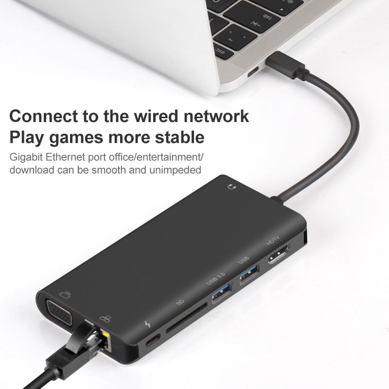 Onten 9591BD 8 in 1 USB-C / Type-C to PD USB-C / Type-C Charging + 100M Ethernet Port + Dual USB 3.0 + HDMI + VGA + SD Card Slot + 3.5mm AUX HUB (Black)