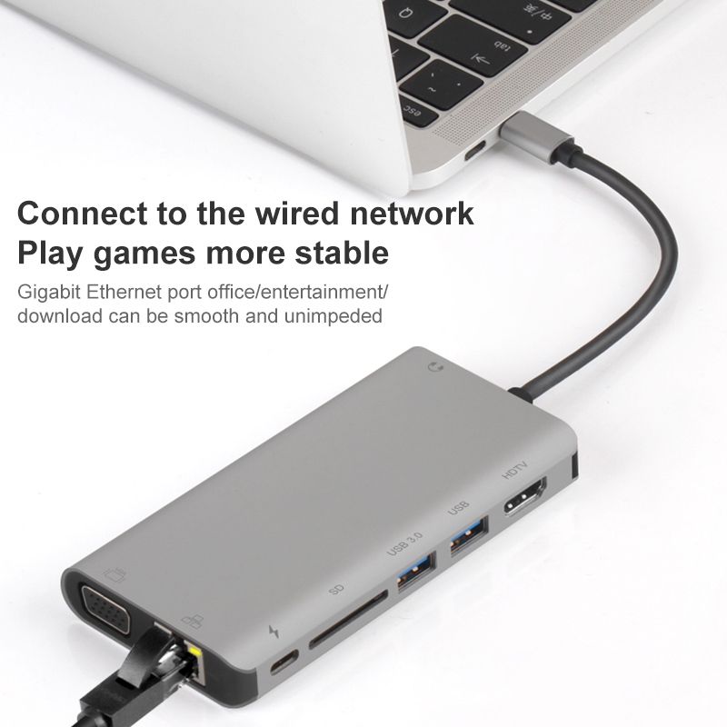 Onten 9591BD 8 in 1 USB-C / Type-C to PD USB-C / Type-C Charging + Gigabit Ethernet + Dual USB 3.0 + HDMI + VGA + SD Card Slot + 3.5mm AUX HUB(Grey)