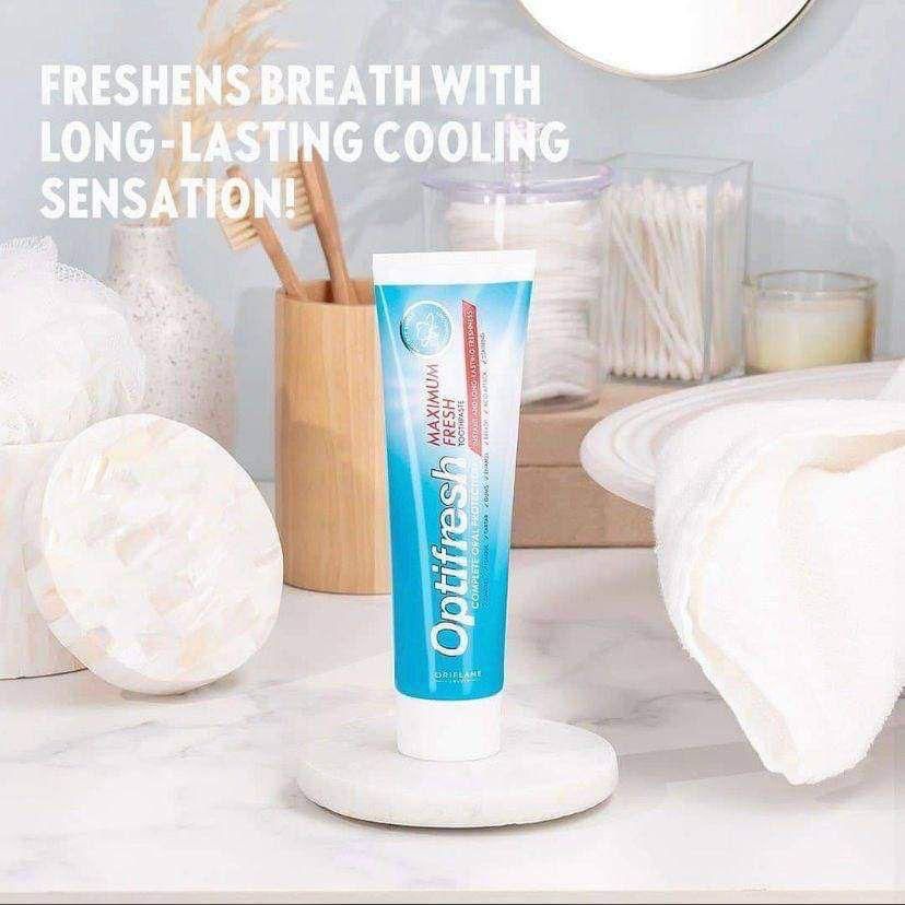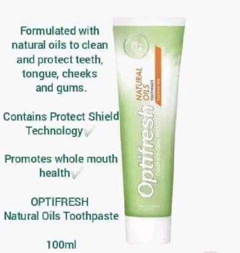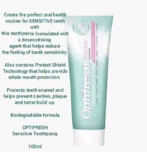 Optifresh toothpaste are of 4 different types which are: optifresh sensitive toothpaste (2) optifresh pro white toothpaste (3) optifresh maximum fresh toothpaste (4) optifresh natural oil toothpaste. Sensitive toothpaste is formulated with desensitising agent to reduce sensitivity.pro White, it whitens the teeth, tongue,gums and cheeks feel healthier.maximum intense freshness in the hole mouth.. Natural oils, it is formulated without fluoride