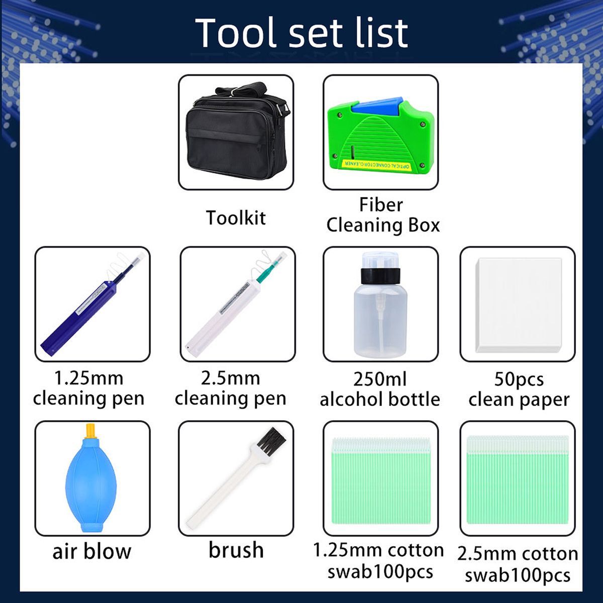 1 x Toolkit,1 x Cleaning box,1 x 1.25mm cleaning pen,1 x 2.5mm cleaning pen,1 x 250ml alcohol bottle(empty),50pcs x Air-laid paper,1 x Air blowing ball,1 x Brush,100pcs x 1.25mm cotton swabs,100pcs x 2.5mm cotton swabs