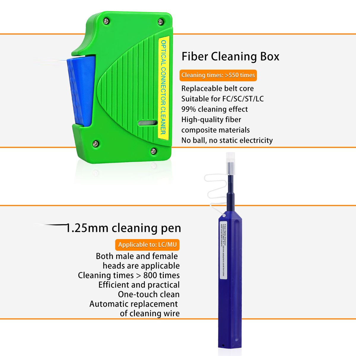The optical fiber cleaning box is made of high-quality fiber composite material. The cleaning times are more than 550. The replaceable core is suitable for FC/SC/ST/LC, with good cleaning effect and no static electricity.