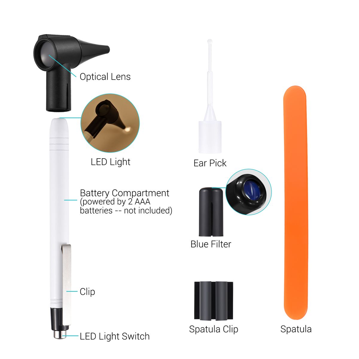 1 x Otoscope,1 x Ear Pick,1 x Blue Filter,1 x Spatula,1 x Spatula Clip,1 x Plastic Box