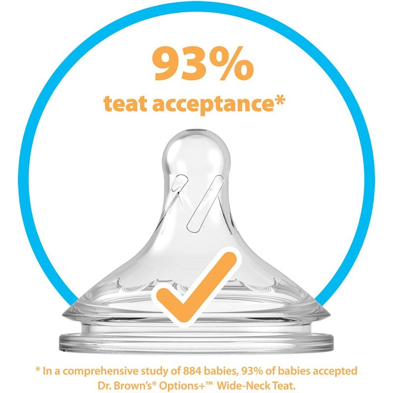 The uniquely designed Dr Brown's Natural Flow® Options+™ Level 1 Wide-Neck Teat is a great place to start with a slow, paced flow, engineered for a consistent rate. The suggested age range for the Level 1 teat is 0 months+ but baby's preferred flow rate may vary.