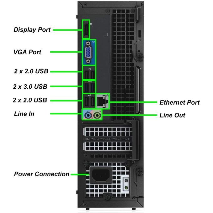 - ABOUT THIS PC : This PC Has 2 x USB 3.0, 6 x USB 2.0, 1 x Display Ports, 1 x VGA, Headphone and Microphone Jack on the front and Back, RJ-45 (Ethernet Port). Intel Graphics, Windows 10 professional 64 Bit.