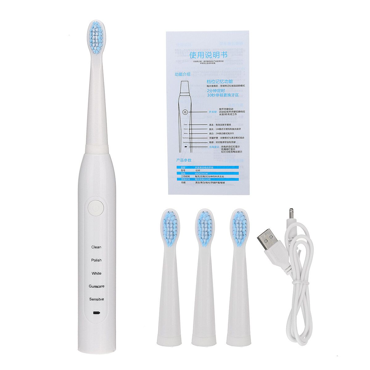 1 x Handle 4 x Toothbrush Head 1 x Manual 1 x USB Cable