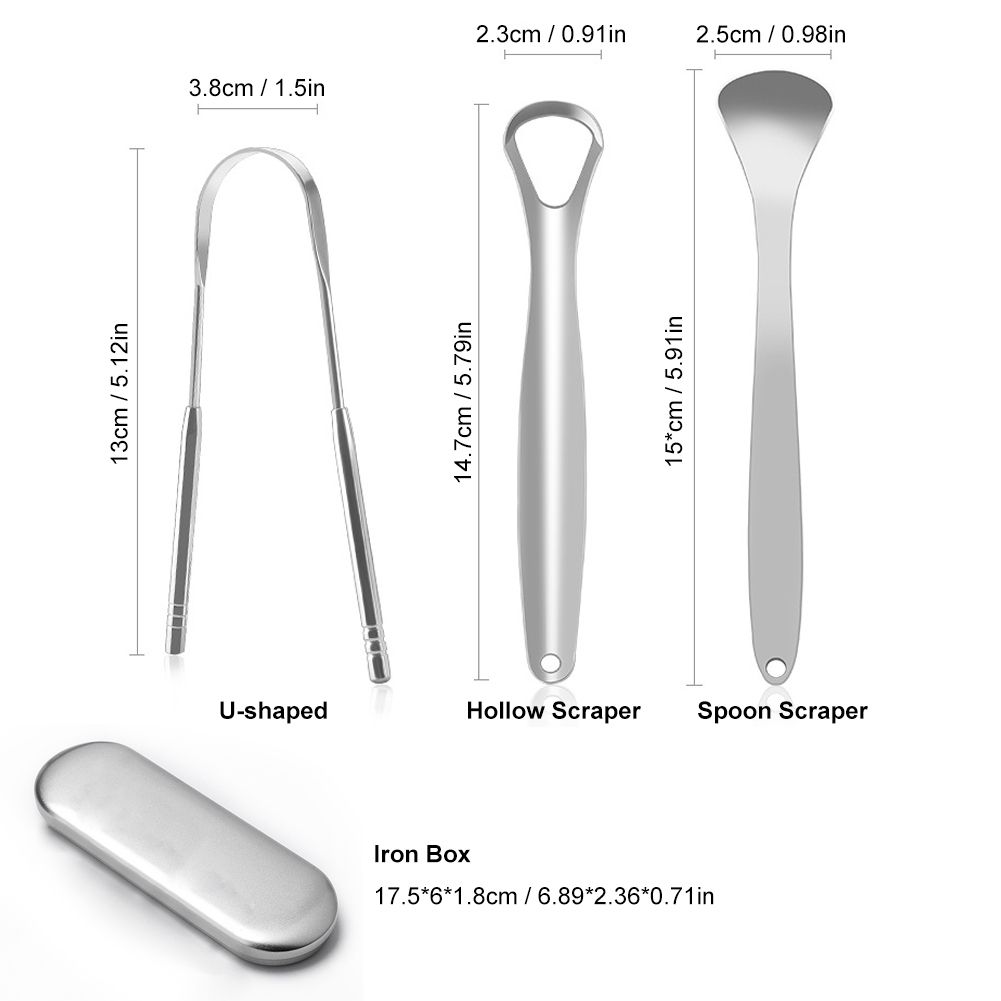 3 x Tongue Scraper,1 x Steel Box,Notes:,1. Size information is just for reference only, please allow 1-2cm (0.4-0.8") differences due to manual measurement, thanks.,2. Item color displayed in photos may be showing slightly different on your monitor since monitors are not calibrated the same.