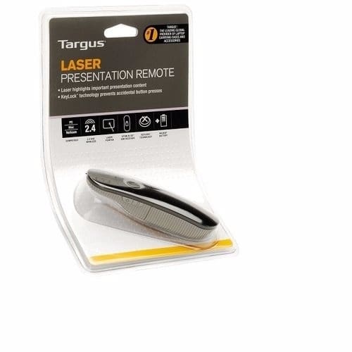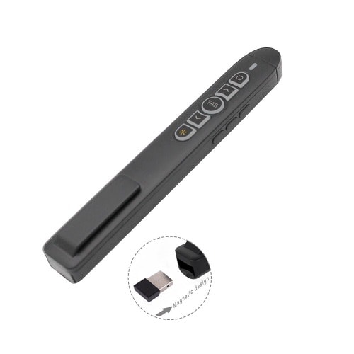 Laser Pointer, slide page change, blank screen button, volume control, mute, plus slideshow start/top buttons.