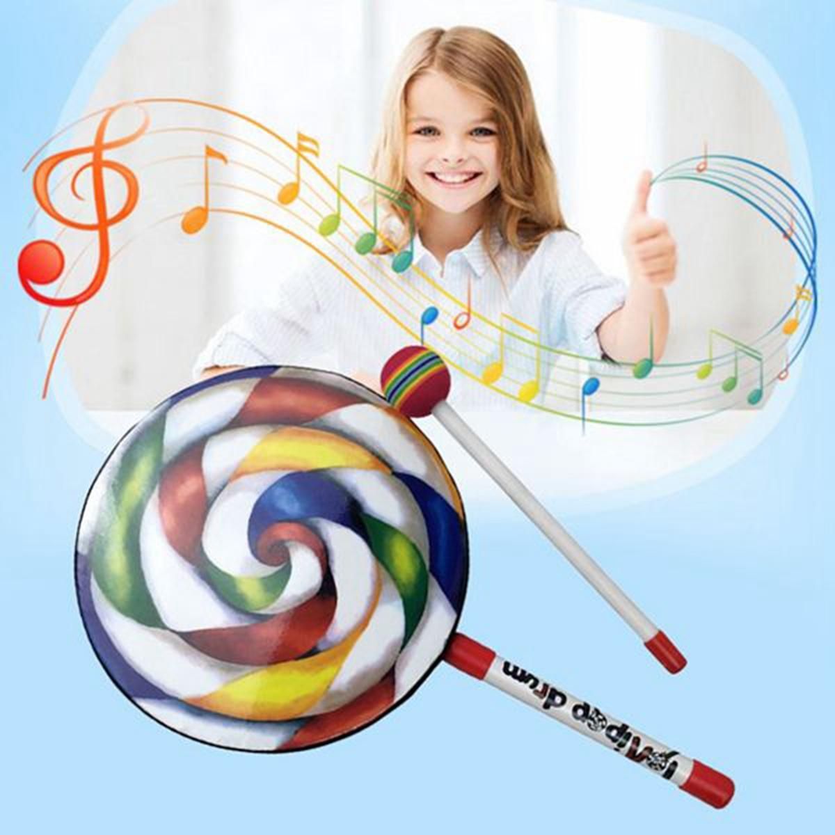 Detailed Information About The Product:The Kids Percussion Lollipop Drum is an easy to play frame drum shaped like a lollipop and features a pre-tuned graphic drumhead with a warm, resonant sound.