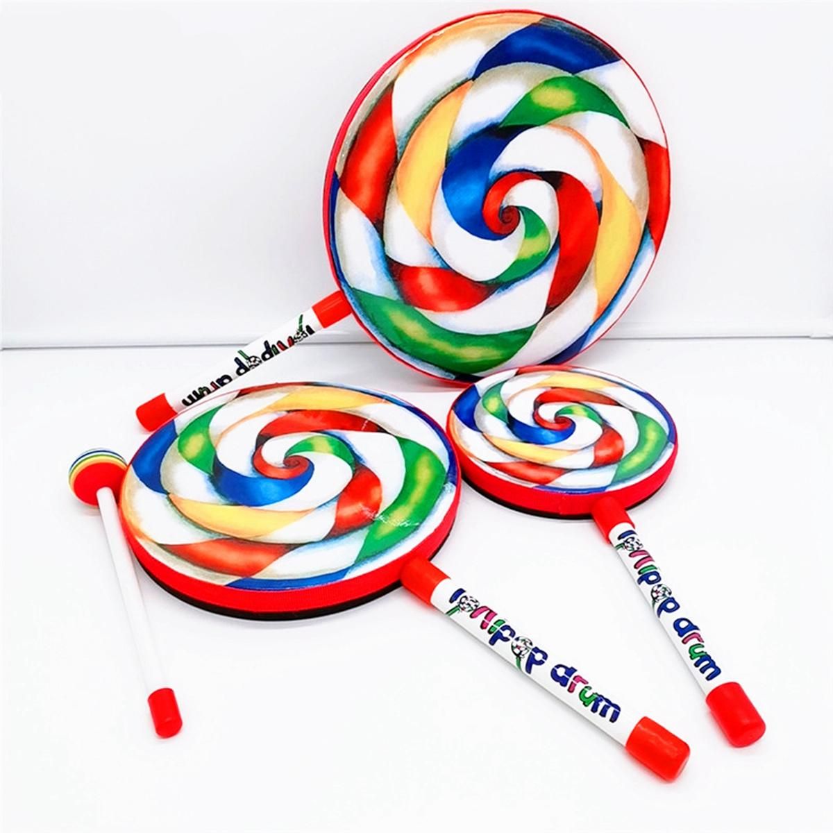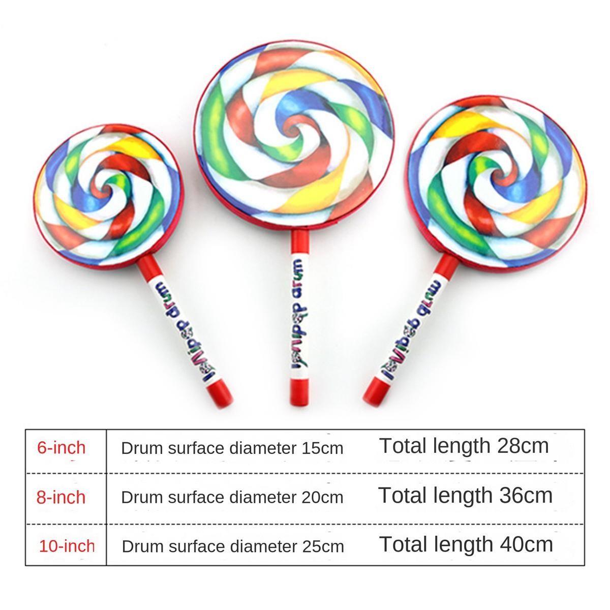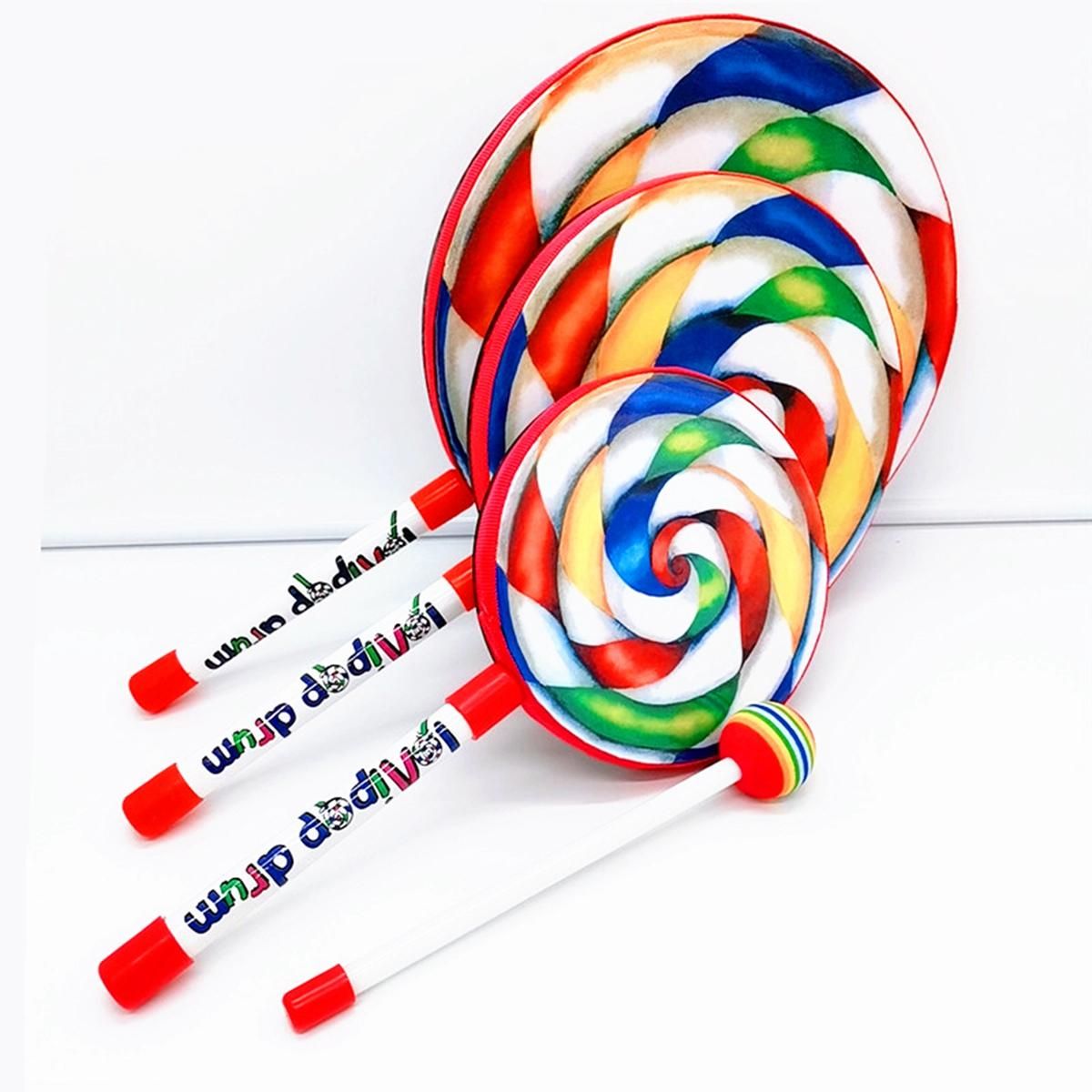 The Kids Percussion Lollipop Drum is an easy to play frame drum shaped like a lollipop and features a pre-tuned graphic drumhead with a warm, resonant sound.