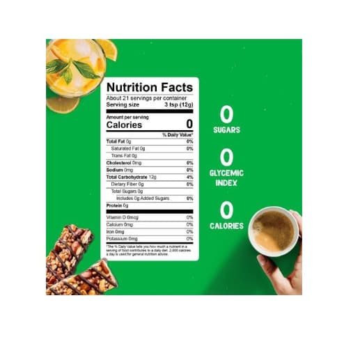 Pyure Organic Monk Fruit Sweetener provides the same taste, texture, and feel as traditional sugar without the added calories or carbohydrates. This sugar substitute is super sweet, so you only need a small amount. There's no bitterness or aftertaste, and it mixes and dissolves well.