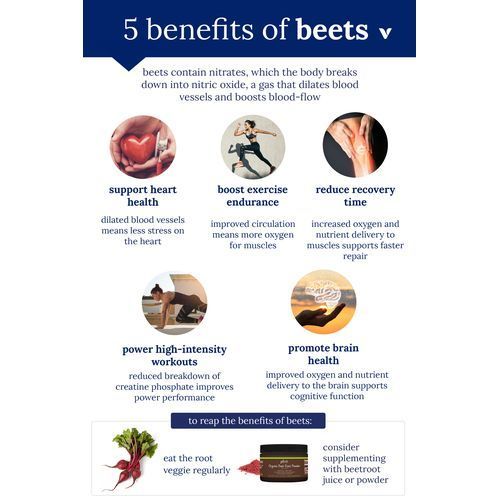 It doesn't end there. The root vegetables also contain nitrates and pigment which provide so many of the amazing beetroot powder benefits. You probably already know about “bad” nitrates from foods like heavily processed meats. Nitrates from plant sources, however, contain antioxidants so they turn into helpful nitric oxide which protects the heart.