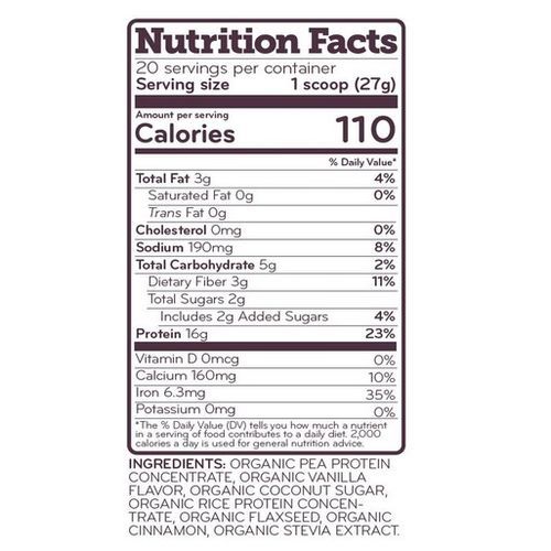 16 grams per serving of organic brown rice and pea protein provide a complete essential amino acid profile.