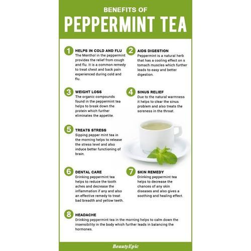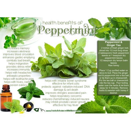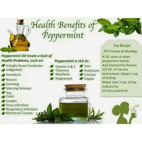 Peppermint can consist of fresh or dry leaves for use in food or as a teaating dried leaves: Used to treat bad breath. Inhaling essential oils: May improve brain function and cold symptoms. Applying it to the skin: Used to reduce nipple pain from breastfeeding. Peppermint has shown health benefits for irritable bowel syndrome (IBS), nausea, skin conditions, headaches, cold, and flu.It can interact with medicines and is not advised for people with gastrointestinal problems. Scientific studies have suggested that peppermint, in various forms, can help treat the symptoms of irritable bowel syndrome (IBS).