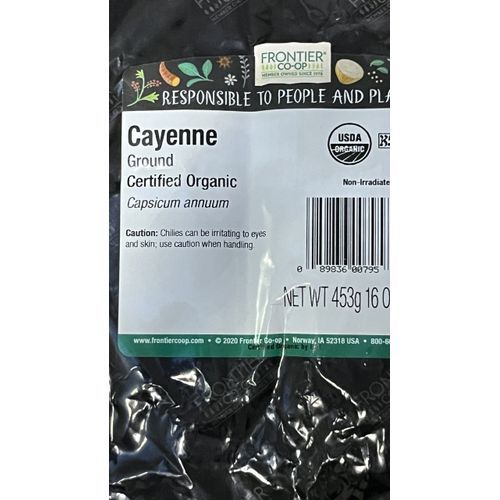 Capsicum annuum Non-Irradiated Kosher This colorful, ground chili pepper will turn up the heat and color in your cooking. Frontier® Organic Ground Cayenne has a 35,000 HU rating. Try it in our Mexican Street Corn Salad, Spicy White Bean Hummus and Crab Cakes with Cayenne and Black Pepper. Add it to hot chocolate. Use it in favorite ethnic recipes, or sprinkle it on at the table whenever a dish needs extra zip. Our organic bulk cayenne is kosher certified and non-irradiated. Owned by stores and organizations that buy and sell our products, Frontier Co-op® has been a member-owned cooperative since 1976. We support natural living and our products are never irradiated or treated with ETO. We're committed to the health and welfare of the environment and everyone producing and consuming our botanical products.