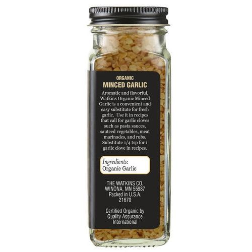 Aromatic and flavorful, Watkins Organic Minced Garlic is a convenient and easy substitute for fresh garlic. Use it in recipes that call for garlic cloves such as pasta sauces, sauteed vegetables, meat marinades, and rubs.