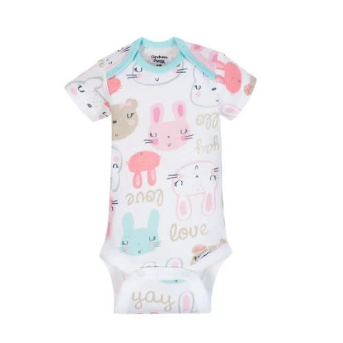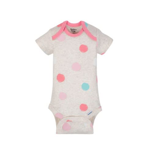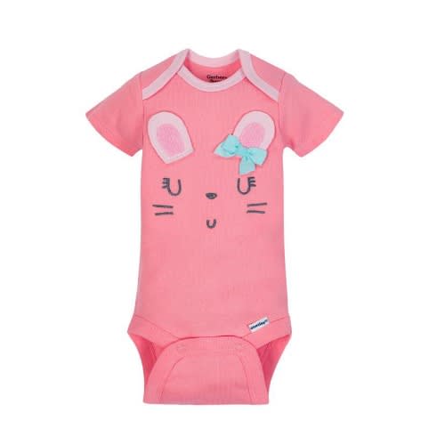includes three organic Gerber short sleeve Onesies bodysuits 100% organic cotton rib baby soft fabric is OEKO-TEX certified to give you peace of mind that no harmful substances will touch your baby's skin expandable lap shoulder neckline to help pull garment easily over baby's head bottom snap closure is conveniently positioned higher in front foil, grosgrain bow, and allover print with glitter artwork imported machine wash / tumble dry