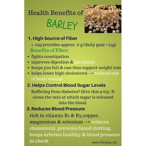 Barley is an excellent source of fiber, which helps lower the total amount of cholesterol in the blood, thereby decreasing the risk of heart disease.