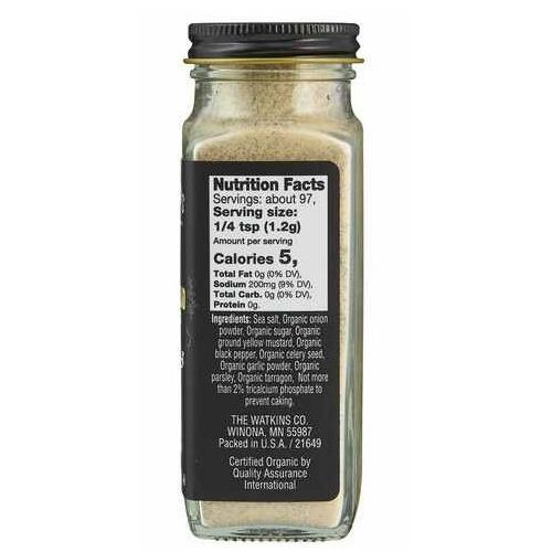 Sea salt, Organic onion powder, Organic sugar, Organic ground yellow mustard, Organic black pepper, Organic celery seed, Organic garlic powder, Organic parsley, Organic tarragon, Not more than 2% tricalcium phosphate to prevent caking. Contains: Mustard