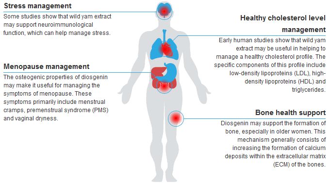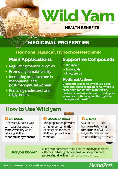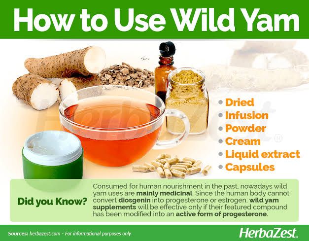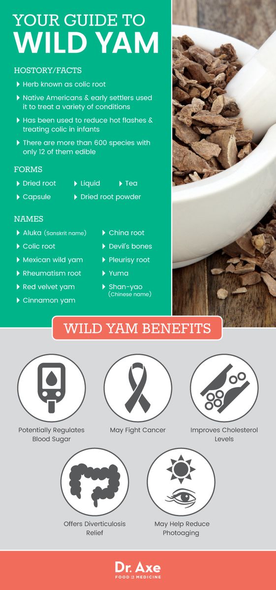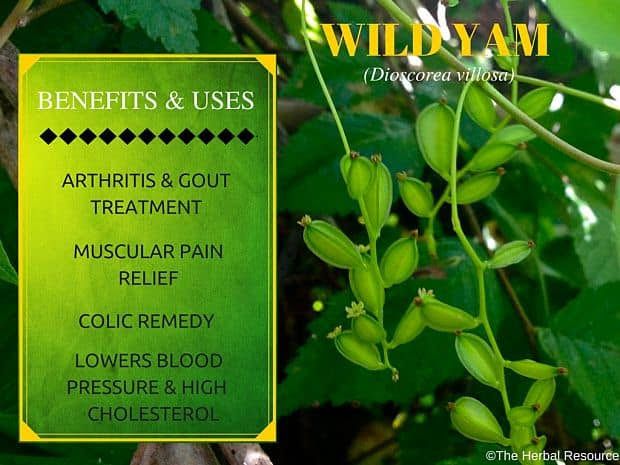 There are various other names for wild yam, such as colic root, devil's bones, rheumatism root, or China root. People who have hormone-sensitive conditions, such as breast cancer or uterineWild Yam root is perhaps most famous for its ability to support women in the health of their reproductive systems. With powerful antispasmodic and anti-inflammatory properties, Wild Yam is often prescribed by herbalists to relieve meHelpingnstrual cramps and chronic pelvic pain. the uterus to work more efficiently during menses, this uterine support allows for proper function of the uterus whilst working to prevent cramping and spasms. fibroids, should not use wild yam. It is possible for wild yam to influence estrogen production and worsen the condition.Even more uses for wild yam have included treating diverticulosis, gallbladder issues, colic, cramps, rheumatoid arthritis and as human steroids. Again, I want to reiterate that some benefits that are related to hormone therapy needs more studies, and as far as we know, the conversion to hormones happens in the lab — not simply from consuming some version ofwildyam. .has been claimed by many as a great way to reduce menstrual symptoms and assist with hormone replacement during menopause,