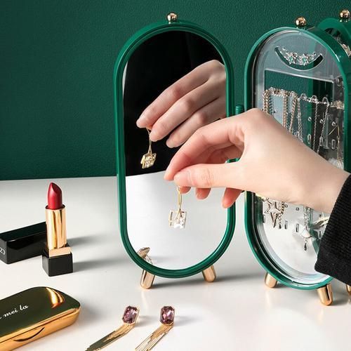 The jewelry storage rack is made of high- plastic. It is multifunctional for household use, folding and convenient display rack, 2 in one function, can be used as a storage box or a mirror, 4 transparent panels, 153 holes/240 holes can hold a lot of earrings and necklace.