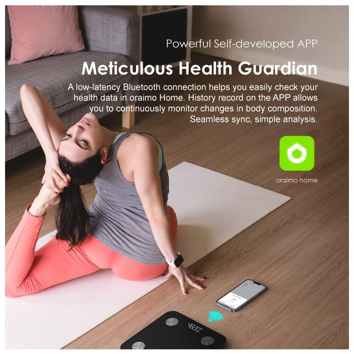 oraimo SmartScale is equipped with multiple high-sensitive sensors. Real-time health data can be easily obtained just by standing on the scale.