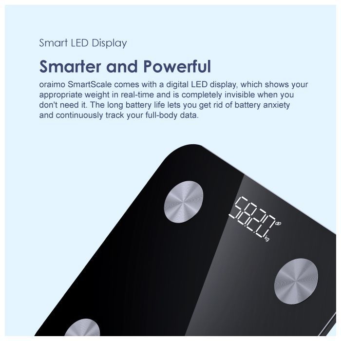 oraimo SmartScale comes with a digital LED display, which shows your appropriate weight in real-time and is completely invisible when you don't need it. The long battery life lets you get rid of battery anxiety and continuously track your full-body data.
