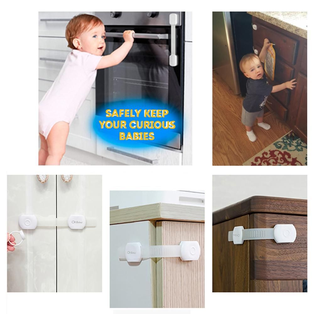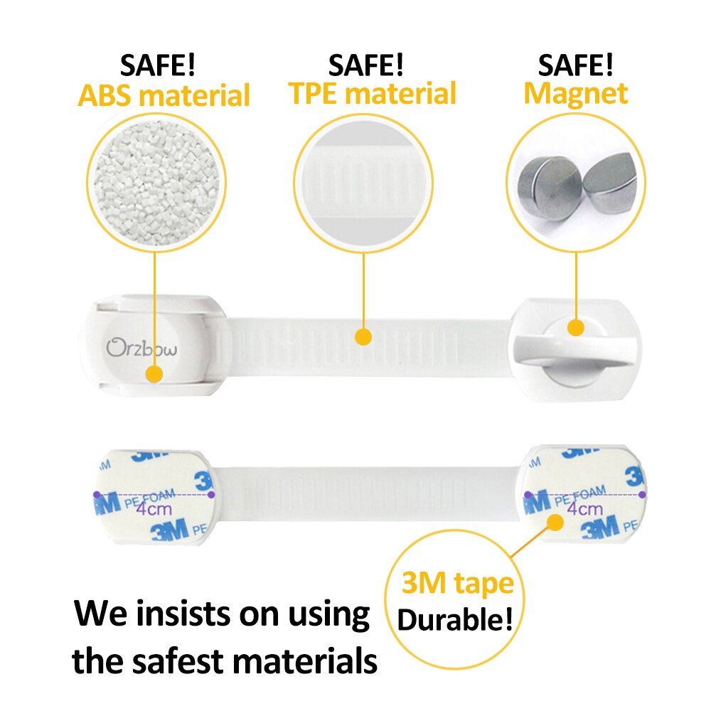 Made of good-quality ABS,TPE along with a firm 3M adherent, these cabinet safety locks can stick on wood or metal alike - the adhesive stays intact for years, at the same time can be removed easily without leaving any residue on the surface