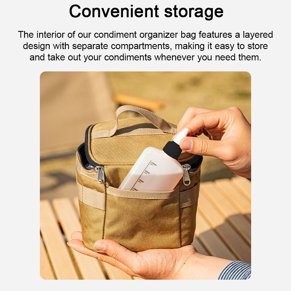 Convenient storage: The interior of our condiment organizer bag features a layered design with separate compartments, making it easy to store and take out your condiments whenever you need them.