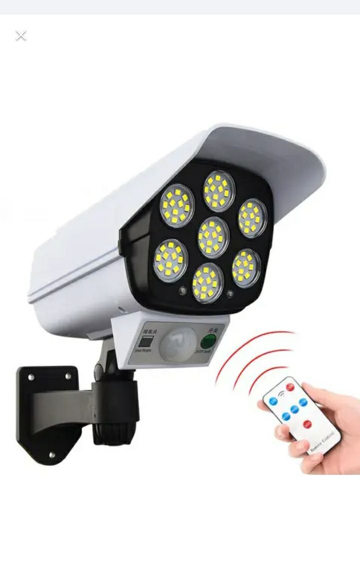 Solar Light With 77 Bright LEDs, motion-activated. Plus realistic dummy camera, when the light on at night, the small red light will flash periodically to serve as a warning.