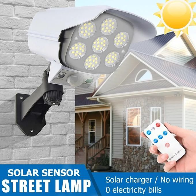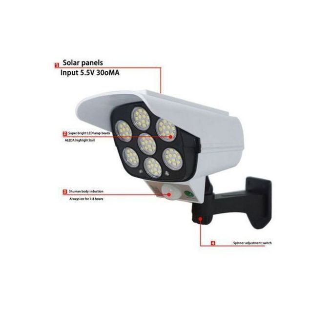 Solar Light With 77 Bright LEDs, motion-activated. Plus realistic dummy camera, when the light on at night, the small red light will flash periodically to serve as a warning.