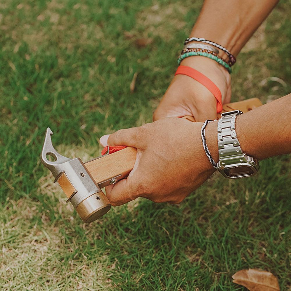 This hammer is a compact size and portable hammer that can be used to get the nail in when you set up your tent and to help you pull out the nail when you remove your tent.