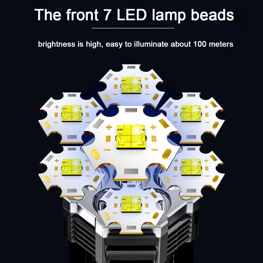 Features:The front 7 LED lamp beads, the brightness is high, easy to illuminate about 100 meters. Equipped with a COB side light, which can be used as a flood light.