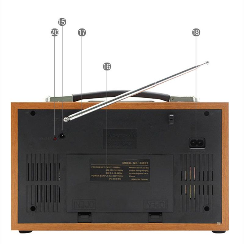Style: portable Type: AM/FM Model: MD-1702Screen: yes Function: Built-in speaker Power supply: pack Power supply mode: AC/DC/ Speakers: dual high-fidelity speakers MP3 player: USB/SD/TF/AUX/wirele Multi-band: FM and AM switch : 6V/1400mA DC: 6V (UM-1X4PCS) AC: 220/50Hz Product size: 27.5*10.5*17CM Color: black/wood Retro radio: yes