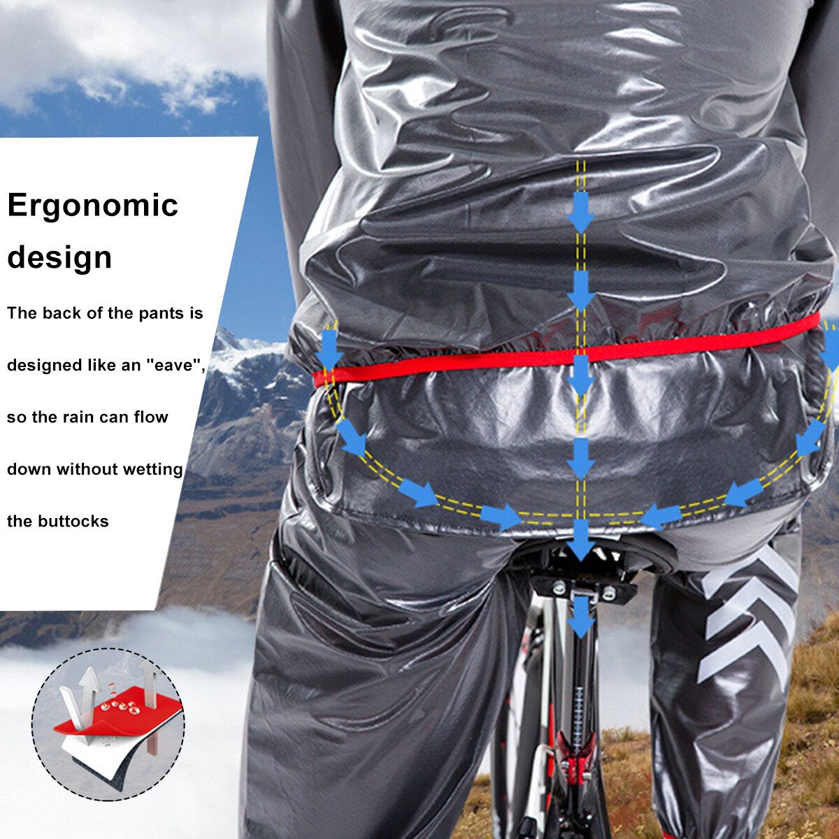 - Ergonomic design,the back of the pants is designed like an "eave", so the rain can flow down without wetting the buttocks.