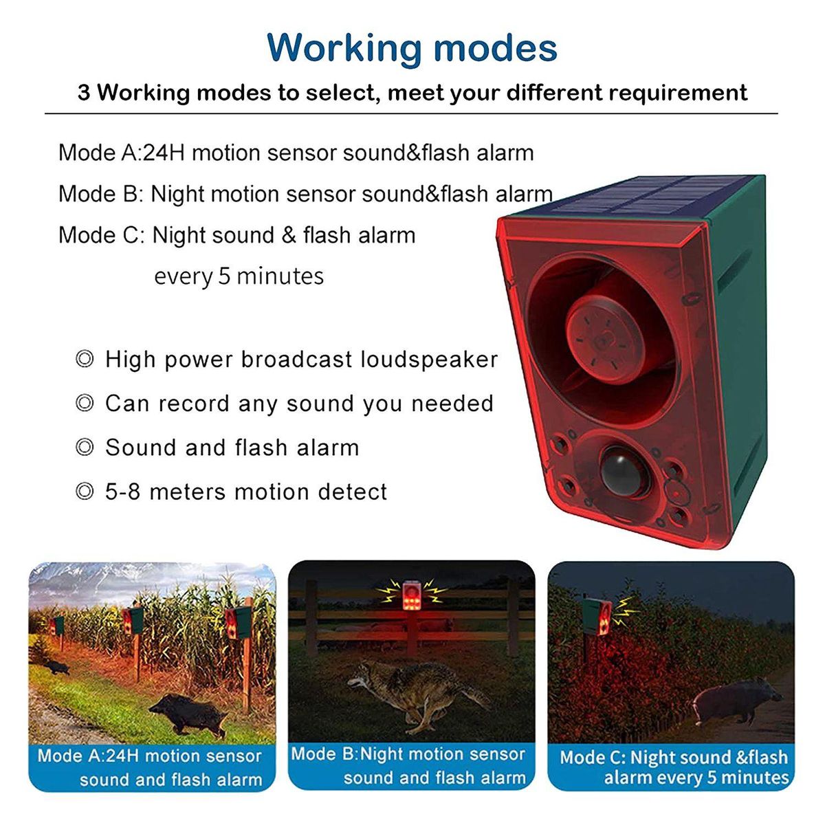[Choose your working mode]Mode B: 24 hours siren and flashing alarm; Mode C: night siren and flashing alarm; Mode A: cycle flashing and alarm sound every 5 minutes at night (automatic).