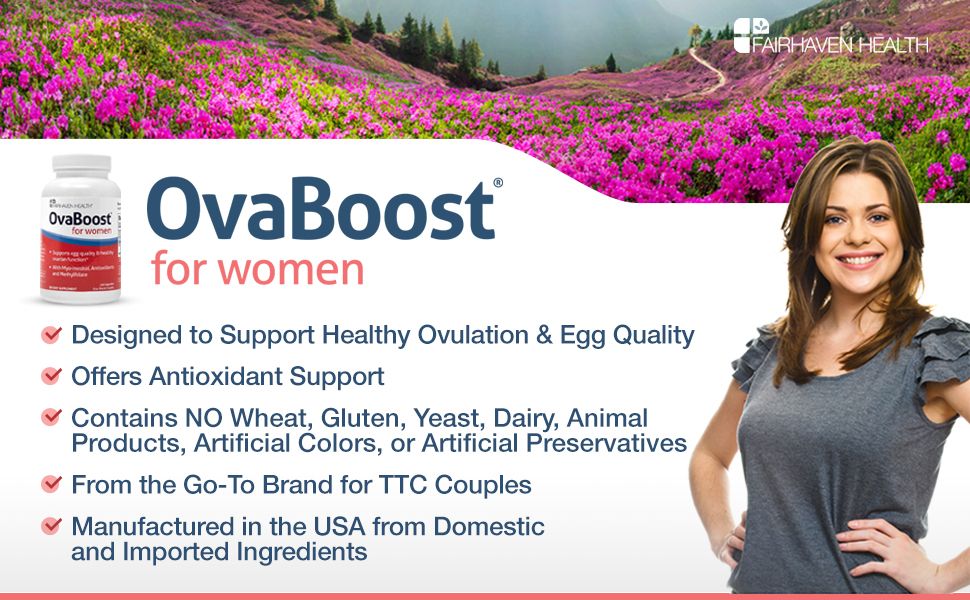 9 Key BenefitsContains folate as Quatrefolic. Healthful diets with adequate folate may reduce a woman's risk of having a child with a brain or spinal cord defect.2 grams of myo-inositol improves ovarian function by increasing insulin sensitivity plus reduces mood swings by balancing hormonesCounteracts the effects of environmental toxins and stress on egg cells with a powerful combination of antioxidantsCoenzyme Q10 gives fertilized egg cells the energy they need to divide and implant in the wall of the uterusDoctor-designed to promote egg quality and support ovarian function in all trying-to-conceive women All Natural! Contains no wheat, gluten, yeast, soy, dairy, animal products, artificial colors, or artificial preservativesRecommended for women of all ages who are trying to conceive, to help protect egg quality from damaging effects of environmental toxins. OvaBoost is especially helpful for women of advanced maternal age and women diagnosed with PCOS.Can be taken in conjunction with FertilAid for Women, a complete pre-natal plus fertility supplement in one, and FertileCM, a cervical fluid and uterine lining supplement Manufactured in the USA in a GMP-certified facility
