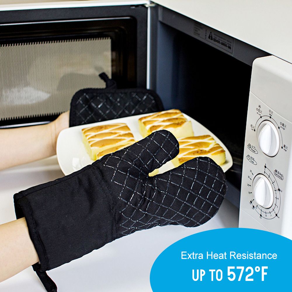 Come with a pair of silicone oven mitts and 2 pot holders.