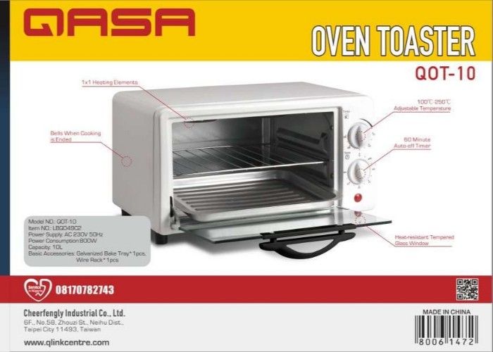 This Qasa 10L Oven Toaster is an essential kitchen appliance with outstanding features that will help you grill your fish, chicken or turkey. A day to day home appliances with a specific end goal to achieve a perfect work in the kitchen as effective, quickly, and at ease. It is safe, durable, easy to open and close and save space. It comes with 800 watts power input, and 10 litres capacity.This Qasa 10L Oven Toaster is an essential kitchen appliance with outstanding features that will help you grill your fish, chicken or turkey. A day to day home appliances with a specific end goal to achieve a perfect work in the kitchen as effective, quickly, and at ease. It is safe, durable, easy to open and close and save space. It comes with 800 watts power input, and 10 litres capacity.15 min timer with bell indicatorHeat selection with 4 settingsQuartz heating elementRemovable lower tray for easy cleanCapacity: 10litresGreat buyEssential for every home